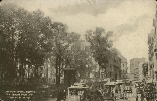 Front: GRANARY BURIAL CROUND OLD TREMONT HOUSE AND TREMONT ST., IN 1880. JAMANTA PLA Back: No. 622. Pub. by Boston Post-Card Co., 12 Pearl St. 4. TWO CENTS