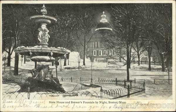 Dear little grand State House and Brewer's Fountain by Night, Boston, Mass.