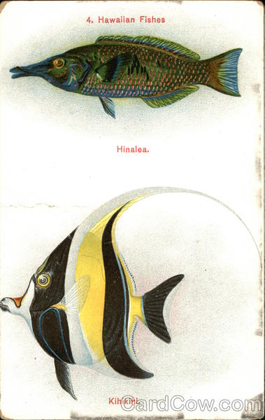 Front: 4. Hawaiian Fishes Hinalea. Kihikihi. Back: GERMANY, Published by the Island Curio Co., Jas. Steiner, Honolulu. 2,50 Private Mailing Card CORRESPONDENCE SPACE POSTAL CARD TWO CENTS
