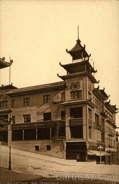 Front: GOODS WHOLESALE SING CHONG CO. 214 CHINATOWN SAN FRANCISCO Trade, Mark CHINESE BAZAAR J. UD 00 Back: CALIFORNIA SALES CO., PUB., SAN FRANCISCO ON THE ROAD OF A THOUSAND WONDERS ний дов Joe C 11704 STAMP