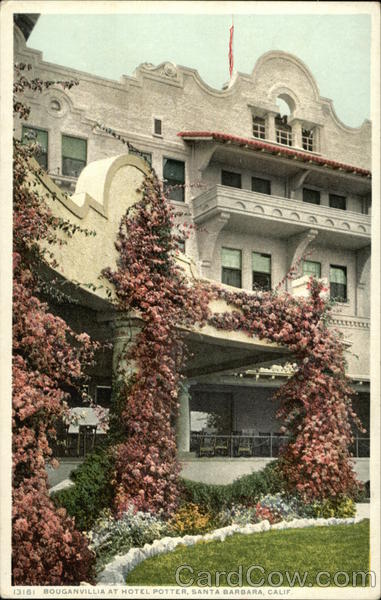 Front: Sa 13181 BOUGANVILLIA AT HOTEL POTTER, SANTA BARBARA, CALIF. Back: MADE ONLY BY DETROIT PUBLISHING CO. "PHOSTINT" CARD. TRADE MARK REG. U. S. PAT. OFF. 3- THIS SPACE MAY BE USED FOR MESSAGE. AND CANADA. FOREIGN. TWO CENTS