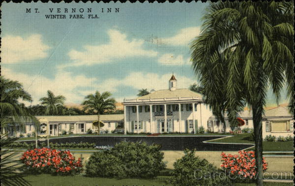 Front: VERNON IN N WINTER PARK, FLA. M T. Back: M T.. VERNON INN WINTER PARK, FLORIDA 1 Mile North of Orlando on U. S. #17 and 92 21 Rooms 21 Baths — Lounge Steamheat Phone: 33444 Owner: L. V. BLEDSOE "Travel 1st Class-It Costs No More" 95-H1596