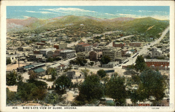 Front: 456. BIRD'S.EYE VIEW OF GLOBE, ARIZONA. 121399 Back: ما jou 0205 PUBLISHED BY HARRY HERZ, PHOENIX, ARIZONA C. T. AMERICAN ART COLORED TE.
