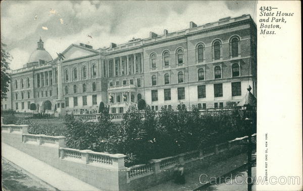 Front: 110 Wa 4343- State House and Park, Boston, Mass. SOUVENIR POST CARD CO., NEW YORK. Back: รว TWO CENTS