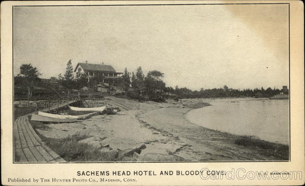 Front: que 95 SACHEMS HEAD HOTEL AND BLOODY COVE. Published by THE HUNTER PHOTO Co., MADISON, CONN. C. C. MARKHAM. Back: 6 *= STAMP.