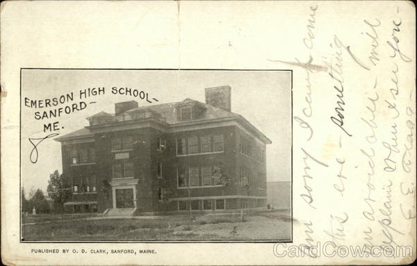 Front: PUBLISHED BY O. D. CLARK, SANFORD, MAINE. 33 ME. EMERSON HIGH SCHOOL And sorry I cant this ere-something un aroidoble - mil explain when I see you come Back: STUNIMA OCT 1910 Miss Rangas. SOSO 62 Clarendon th St Berlini. Mass_