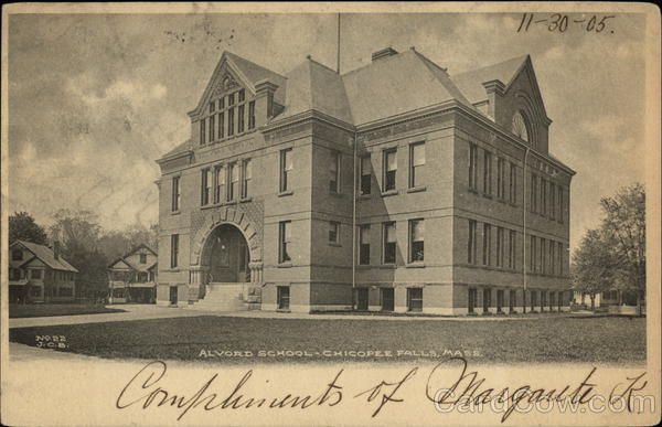 Front: No 22 J.C.B. FALFORD SOHOOL 11-30-05 ALVORD SCHOOL - CHICOPEE FALLS, MASS. Compliments of Margante R. Back: WOO NOV 4. ame UNITED ST 1706 FRANKE atton Ave, New Staren. Conn. WEN Wa