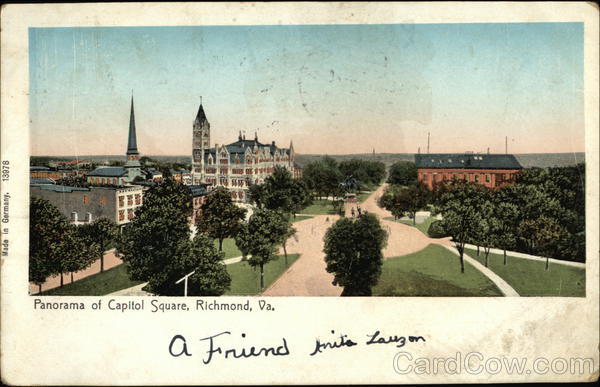Front: Made in Germany. 13978 LEG HAR 1041 Panorama of Capitol Square, Richmond, Va. A Friend thits Lauzon Back: FALL RIVER JAN16 1-AM MASS 19 06 Miss Louise Rioux 53 Palmer St. City UNIT Hana SERIEN 1907 ED STATES OF 1706 FRANKLIN 1790 ONE CENT