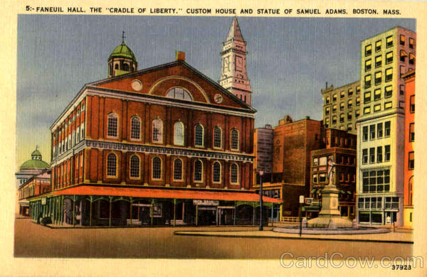 5:- FANEUIL HALL. THE "CRADLE OF LIBERTY." CUSTOM HOUSE AND STATUE OF SAMUEL ADAMS. BOSTON. MASS.