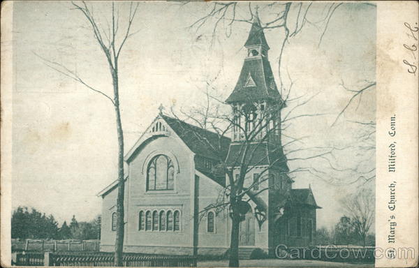 Front: He 20 ICTORY UND St. Mary's Church, Milford, Conn. в. в. н. Back: GH POSTAUCARD 4-AM MASS AN LIT AXRIES 1907 UNITED STATES O Miss Margaret b. Murphy, 121 Bond St. Springfield, Cass. 1706 FRANKLIN 1790 ONE CENT