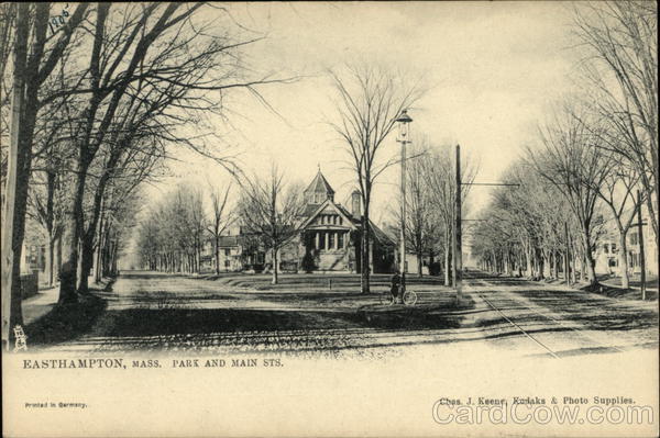 Front: KHA SVEW EASTHAMPTON, MASS. PARK AND MAIN STS. Chas. J. Keene, Kodaks & Photo Supplies. Back: Rapbae: Tuck & Sons' Post Card Series No. 22ยน6 "EASTHAMPTON, Mass" ART PUBLISHERS TO THEIR MAJESTIES THE KING AND QUEEN. 32 ARTISTIE RES