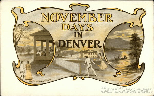 Front: NOVEMBER DAYS IN DENVER TYPICAL NOVEMBER SCENE 770 DENVER COUNTRY CLUB AT THE FOOT OF THE ROCKIES Back: 750 En and Canada, Foreign, Two Cents