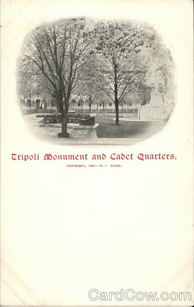 Front: 0000 Tripoli Monument and Cadet Quarters. COPYRIGHT, 1900 - M. C. DUGAN. Back: AUTHORIZED BY ACT OF CONGRESS OF MAY 19, 1898, Private Mailing (POSTAL CARD-CARTE POSTALE.) Annapolis 5 HERE.