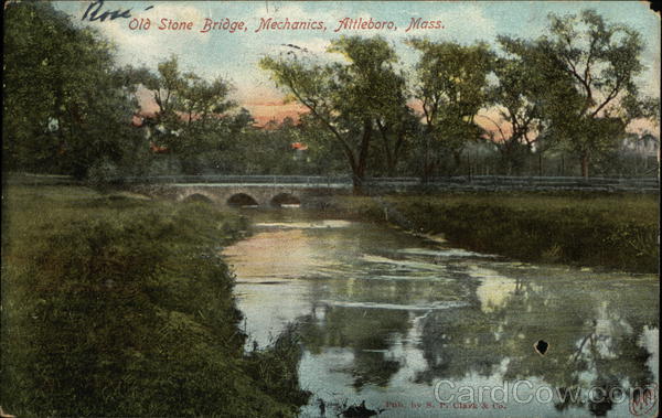 Front: Rov me Old Stone Bridge, Mechanics, Attleboro, Mass. Pub, by S. P. Clark & Co. Gre Back: 8124. Made in Germany. No. We TRADEMARK POST CRE レーBMA JOS Welle Louise Riniſ 53 Falmer Sto OGNITIVE 9021 TO SAVES CELINT Frace Rim Mäss