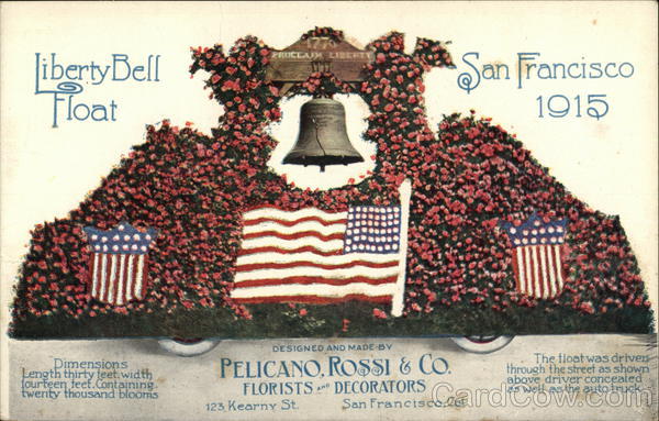 Dimensions: Length thirty feet, width fourteen feet, containing twenty thousand blooms. Designed and made by Pelicano, Rossi & Co., Florists and Decorators, 123 Kearney Street, San Francisco, Cal. The float was driven through the street as shown above, driver concealed as well as the auto truck. |