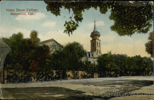 Front: Notre Dame College, Marysville, Cal. 11 2018 Back: RANCIS YSI MAY 30PM 19-PM09, 12 CALOS CAL ра SCO M. Rieder, Publ., Los Angeles, Cal. No. 4908. Made in Germany. HON ONE CEN Mrs B. & Gillespice 925 Piercest S. Fr бас