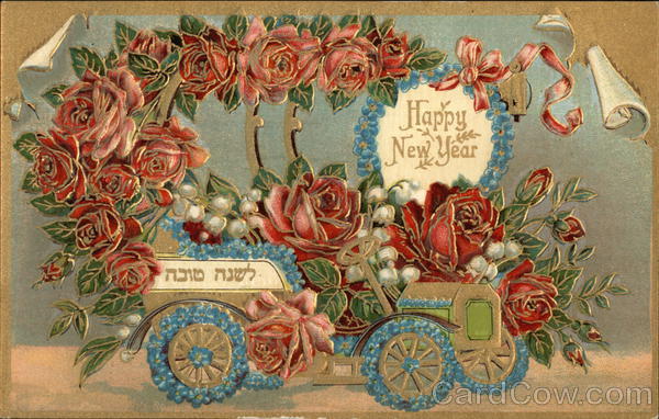 Embossed greeting card featuring a decorative car-like vehicle adorned with red roses and blue berries, with 'Happy New Year' and 'לשנה טובה' (L'shanah Tovah) text.