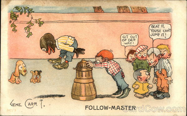 Front: VENE. CARR 1. 242/3 su We 25 GIT OUT OF DER WAY! FOLLOW-MASTER BEAT IT, YOUSE CANT JUMP IT! MUST udent's Copyright 1907, By The Rotograph Co, N.Y. Back: THIS SPACE MAY BE USED FOR WRITING THE ROTOGRAPH Co. N.Y. CITY TWO CENTS