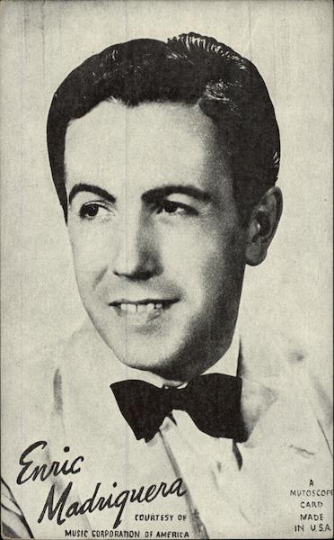 Front: prot, Enric Madriquera OF MUSIC CORPORATION OF AMERICA MUTOSCOPE MADE IN V.S.A. Back: SIDE FOR CORRESPONDENCE A MUTOSCOPE CARD FOR ADDRESS ONI HERE
