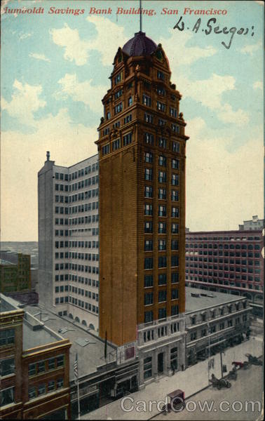 Front: Tumboldt Savings Bank Building, San Francisco TI 36 4. A. Seegos: Back: Amenaus Ran L. A. Seegar Thanks for the caref AMERI JUN 14 445 19 Dom M. Cargir 115- Summer St Franklin Mass