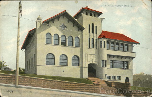 Front: 1376 CITY HALL CITY HALL, REDONDO, CAL. Back: Published by The Benham Co., Los Angeles, Cal. C9 MADE IN NEUNER CO CALITYPE مدعمة CALIFORNIA 2 CENTS