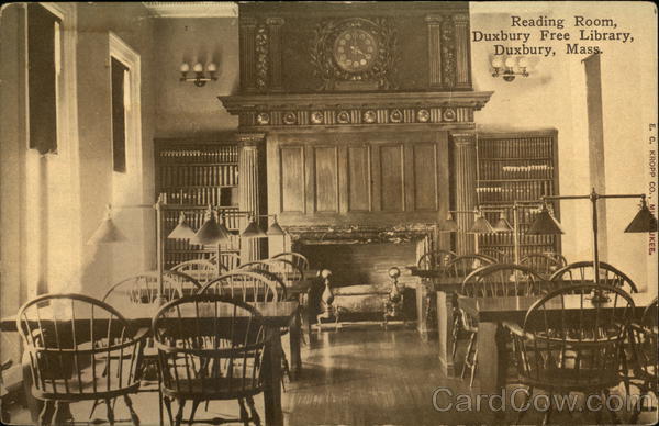 Front: Gat | 11 | JAK e||||||*||||||||||| Reading Room, Duxbury Free Library, Duxbury, Mass. 5₁ E. C. KROPP CO., MILWAUKEE. Back: THIS SPACE MAY BE USED FOR WRITING GREAT BRITAIN FOREIGN: TWO CENTS.