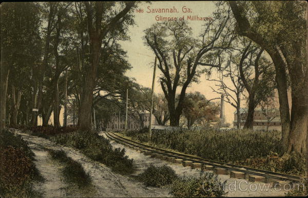 Front: 948 Savannah, Ga. Glimpse of Millhaven Back: 5.9-AM D THE HUGH C.LEIGHTON CO., MANUFACTURERS, PORTLAND, ME., U.S.A Am having a good time and feeling Miss Bessie E. Reford, fine. Raymond Thin ink, Water, ******** Canton lass.