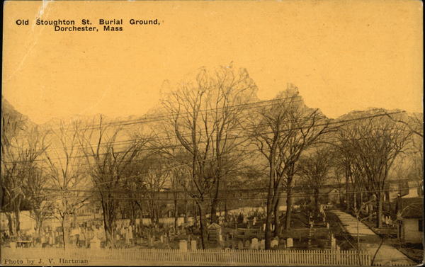 Front: Old Stoughton St. Burial Ground, Dorchester, Mass Photo by J. V. Hartman Back: Pub. by J. V. Hartman & Co., Boston, Mass. Series 64 This side may be used for correspondence. This side for address only.