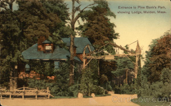 Front: Entrance to Pine Bank's Park, showing Lodge, Malden, Mass. Back: - 14 790 The Metropolitan News & Pub. Co., Boston, Mass. & Germany. Me 2981