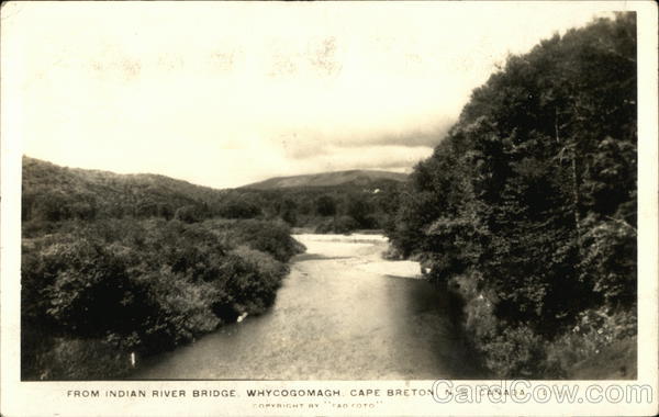 Front: FROM INDIAN RIVER BRIDGE, WHYCOGOMAGH. CAPE BRETON. N S CANADA COPYRIGHT BY FAD FOTO 12-62 Back: MADE POSTES LDW ENT POSTES To POSTE Spis Malen H Halley #52 brescent ht Wakefield, Masſ. am fishing out Lake Aimelay on a days