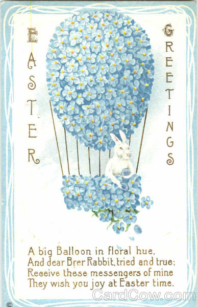 A big Balloon in floral hue, And dear Brer Rabbit, tried and true,; Receive these messengers of mine They wish you joy at Easter time.