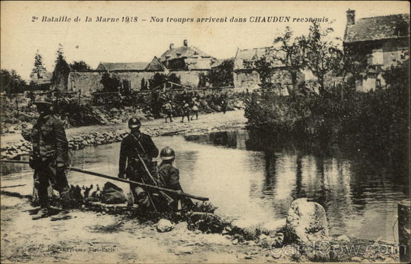 Front: 2e Bataille de la Marne 1918 - Nos troupes arrivent dans CHAUDUN reconquis Express - Visé Paris Back: PHOTOTYPIE BAUDINIERE Adresse