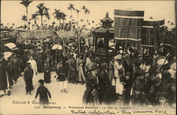 Front: Ce Collection R Bonal, Haiphong. 144. Haiphong. Procession Annamite La Fête du Pagodon (3) Native celebration - Very common here ** Back: 司公難奔相湯 Adresse