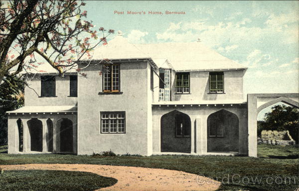 Front: We Poet Moore's Home, Bermuda Back: Published by Phoenix Drug Co., Prescription Druggists, Hamilton, Bermuda No. 9 MESSAGE MAY BE WRITTEN ON THIS SIDE PAS WET MONE BERMUDA Stamp.