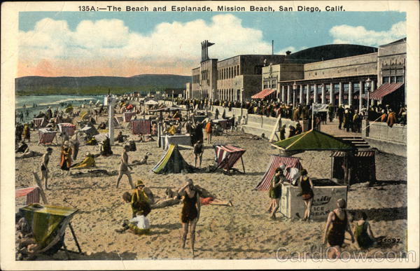 Front: 135A: The Beach and Esplanade, Mission Beach, San Diego, Calif. ICE REA BLU 3097 Back: Pub. by the M. Kashower Co., Los Angeles, Cal. Photo by L. K. Dewein. MADEMUSA IN STAMP HERE