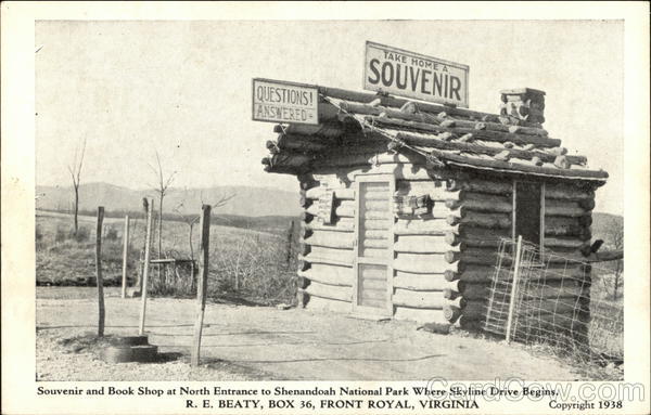 QUESTIONS! ANSWERED TAKE HOME A SOUVENIR Souvenir and Book Shop at North Entrance to Shenandoah National Park Where Skyline Drive Begins. R. E. BEATY, BOX 36, FRONT ROYAL, VIRGINIA Copyright 1938