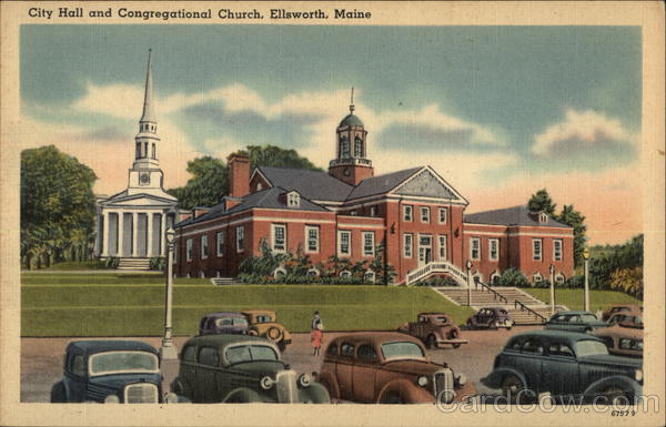 Front: City Hall and Congregational Church, Ellsworth, Maine 6757 9. Back: MADE IN U. S. A *TICHNOR QUALITY VIEWS" REG. U.S. PAT. OFF. MADE ONLY BY TICHNOR BROS., INC., BOSTON, MASS.