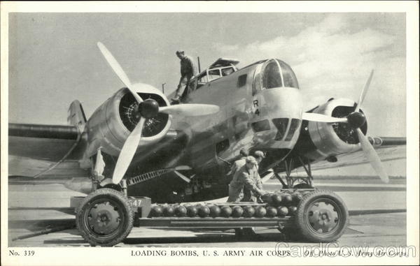 Front: $47 No. 339 LOADING BOMBS, U. S. ARMY AIR CORPS Off. Photo U. S. Army Air Corps. Back: Defend Your Country- Join the U. S. Army. W. R. THOMPSON & COMPANY, PUBLISHERS, RICHMOND, VIRGINIA