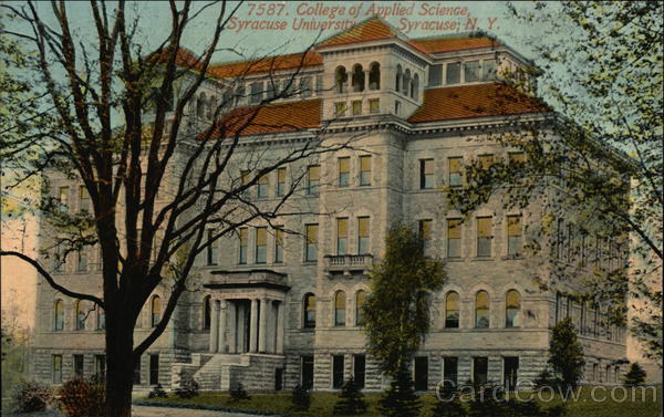 Front: 7587. College of Applied Science, Syracuse University morulan mem ↑ H 2000 Syracuse; N.Y. FE LOGE APPLES BENCE UTTALE PAST Back: Students' Supply Store, Syracuse, N. Y. ܥܠܐ TWO CENTS