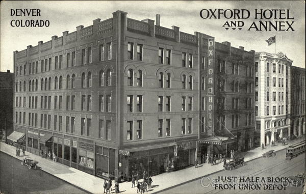 Front: DENVER COLORADO *** 201 11 450344 52 33 11 11 OXFORD HOTEL AND ANNEX 10 16 11 II II JUST HALF A BLOCK FROM UNION DEPOT Back: THREE POPULAR PRICED CAFES AND DAIRY LUNCH ROOM.