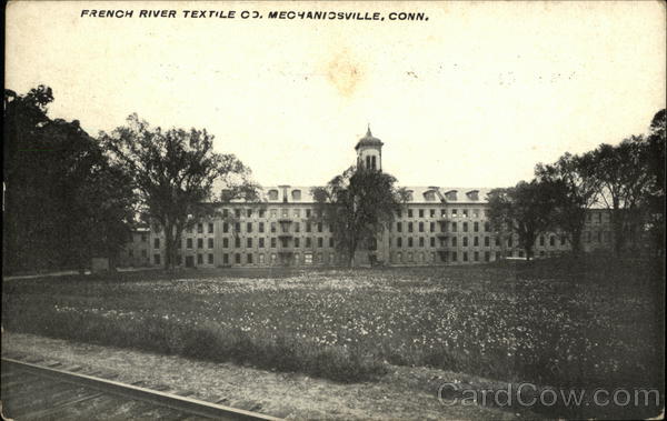 Front: FRENCH RIVER TEXTILE CO. MECHANICSVILLE, CONN. T778831 MIRTIETOTT 0000000000000 DOMUTE Back: SITNAM.COM POSTA P 3-3 UT 1914 later. Will Edith. will write i bom d time address U.S.FOSTAGE 107 Mr. Genge Dichiar dom Lespedale Mass