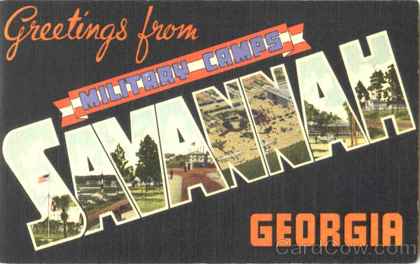Front: Greetings from MILITARY CRMPS GEORGIA Back: 12.50 COLOUR PICTURE SAVANNAH GA PUBBY COASTAL NEWS CO PUBLICATION CAMBRIDGE MASS U.S. A