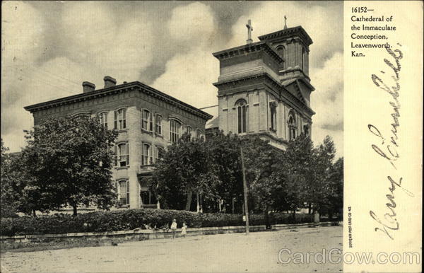 Front: 16152- Cathederal of the Immaculate Conception, Leavenworth. SOUVENIR POST CARD CO N.X Kan. Harry Back: LEAVE SEP to 1969 KAN Miss Hora Cargill 115 Summer St Franklin Mass