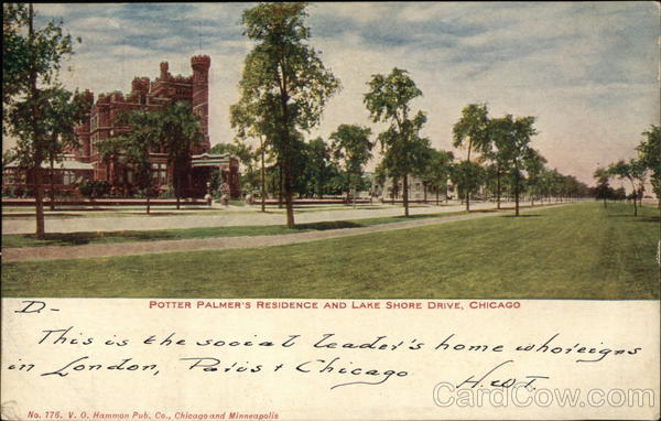 Front: ۔ج POTTER PALMER'S RESIDENCE AND LAKE SHORE DRIVE, CHICAGO کThis is the social laadles home ahosetgns in London, Paris t No. 176. V. O. Hammon Pub. Co., Chicago and Minneapolis Chicago H.E.T. Back: Pora FOREIGN, TWO CENTS.