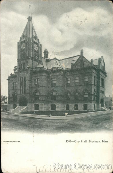 Front: SOUVENIR POST CARD CO N.X 4302-City Hall. Brockton, Mass Willard. N n Back: 300⁰ TE Dern осктом BROCKTON JUL 31 MONTELLO 12 M Miss Ella Mc Caw Thames St 9061 de 9 CAMBOD 187ՈՐ 2012 J 70 DY SERIES 1902 UNITED STATES OF 1706 FRANKLIN 1790 1903