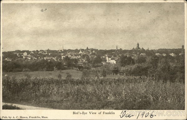 Front: Pub. by A. C Mason, Franklin, Mass. Bird's-Eye View of Franklin *.1.1 Dix- 1906- Back: TWO CENTS