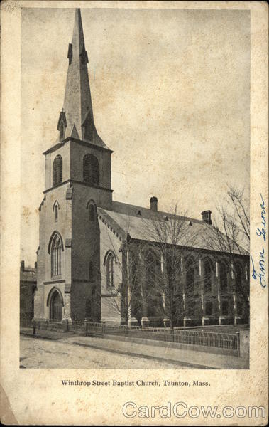 Front: Winthrop Street Baptist Church, Taunton, Mass. of mo Back: Post Ea SALTO Ins Bertha bumminge NON €. E TON WAY 24 12 M 1906 MASS #520 Somerset ave CHEFFE NERTEN 902 NITED IATES OF DOSSING Jaunton 90 61 doc-t FOGFRANKLIN mare.
