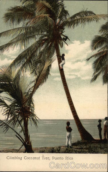 Front: Climbing Cocoanut Tree, Puerto Rico Back: * 2/ Trees Coconu Plore Slamp ile e me to Waldrop Photo. Co., San Juan, P. R. (Printed in Germany).