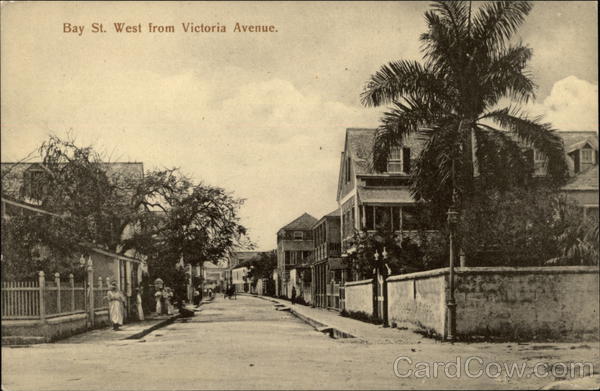 Front: Bay St. West from Victoria Avenue. Back: pe Bahamas Nassau DESCRIPTION AND Photo by J. O. Sands, Nassau.