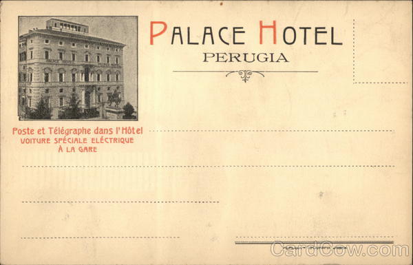 Front: PALACE HOTEL PERUGIA PARACE HOTE. %3D Poste et Télégraphe dans l'Hôtel VOITURE SPÉCIALE ELÉCTRIQUE À LA GARE PERUDIA TIPUGRAFIA JNIONA Back: PALACE HOTEL Perugia 190